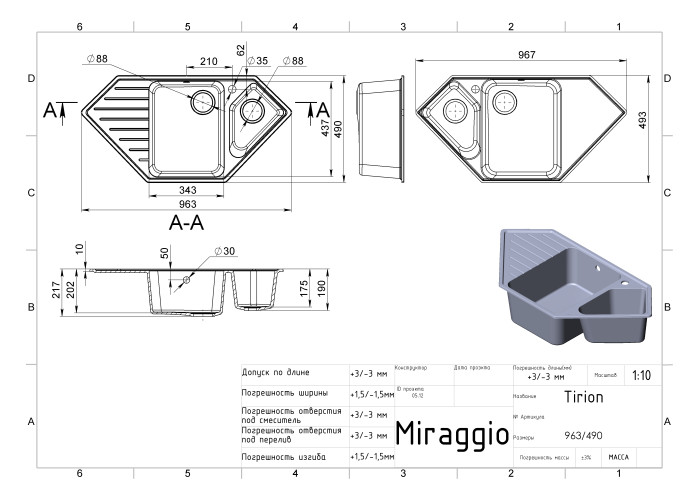 Кутова кухонна мийка Tirion представлена в 6 кольорах: білий, жасмин, пісочний, терра, сірий і чорний. Замовляючи кухонну мийку в інтернет-магазині сантехніки Miraggio ви отримуєте гарантію 10 років, 90 днів на обмін товару, а так само безкоштовну доставку.