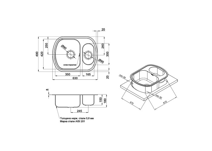 Мийка, сифон, зливник/перелив, кошиковий вентиль, ущільнювальна стрічка.