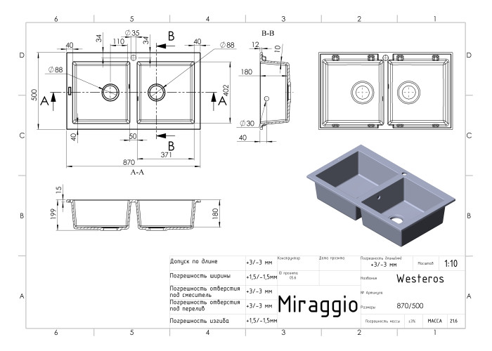 Кухонна мийка з двома однаковими прямокутними чашами. Westeros - дуже практична і містка модель від українського виробника Miraggio. Основний матеріал - кварцовий пісок, розмір 870*500*199 мм.