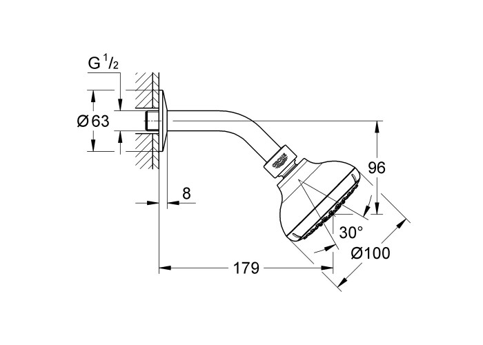 Лійка для верхнього душу Grohe New Tempesta 100 27870001 і душовий кронштейн довжиною 179 мм виконані з латуні, яка стійка до корозії та зносу, робоча поверхня - з пластику. Лійка монтується без особливих зусиль та додаткових підручних засобів. У ній передбачено чотири типи струменя, де Rain - рівномірний поток, Rain O2 - рівномірний потік з додаванням повітряних бульбашок, Massage - потужний напір з центральних форсунок, Jet - інтенсивний збадьорюючий напір.