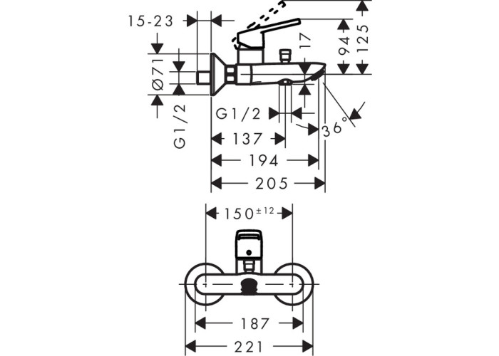 Выступ 194 мм; вид соединения: S-образные эксцентрики; межосевое подключение: 150 мм ± 12 мм; обычная струя; расход воды при наполнении ванны 20 л/мин и расход воды у ручного душа при давлении 3 бар: 17 л / мин; керамический узел смешивания; регулируемое ограничение температуры; с переключателем вакуумного типа; клапан обратного тока воды; с шумопоглотителем; подходит для проточных водонагревателей; класс шума: I; класс расхода воды: C, B