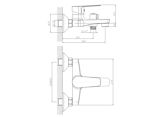 LOTUS cмеситель для ванны однорычажный, настенный монтаж, цвет - хром, картридж 35 мм.