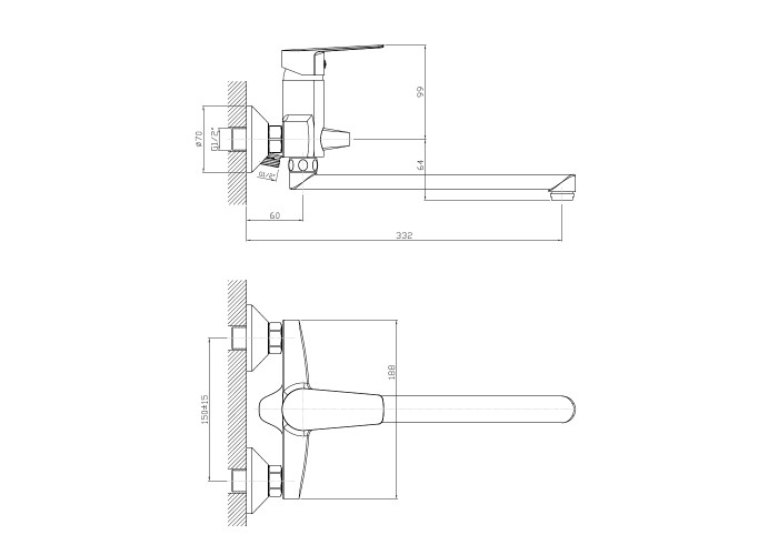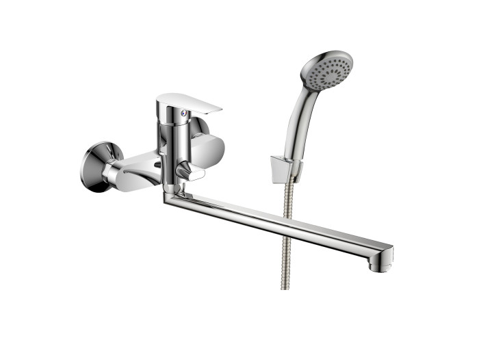 LOTUS смеситель для ванны однорычажный, настенный монтаж, поворотный излив, переключатель ванна/душ встроен в корпус, прямой излив.