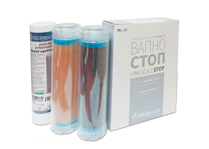 Набір стандартних фільтрувальних 10 дюймових картриджів для пом'якшення води: CPP 10 - картридж відділяє механічні домішки до 10 мікрон, QA CF - картридж з високоефективною катіонітовою смолою пом'якшує воду, LA - кокосове вугілля покращує запах, зменшує вміст хлору.