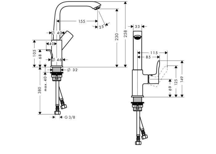 Metris 230 Смеситель для раковины, однорычажныйВыступ 155 mm, обычная струя, расход воды: 5 л/мин, поворотная область 120°, подходит для работы с проточным водонагревателем