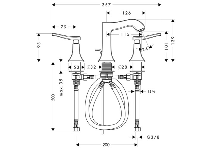 Metris Classic Смеситель для раковины, двухвентельный Выступ 115 mm, обычная струя, расход воды: 5 л/мин, подходит для работы с проточным водонагревателем