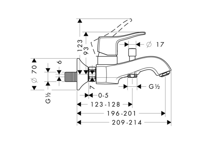 Metris Classic Смеситель для ванны, однорычажный Выступ 123-128 mm, тип соединения: S - соединение, обычная струя, расход воды: 22 л/мин, подходит для работы с проточным водонагревателем