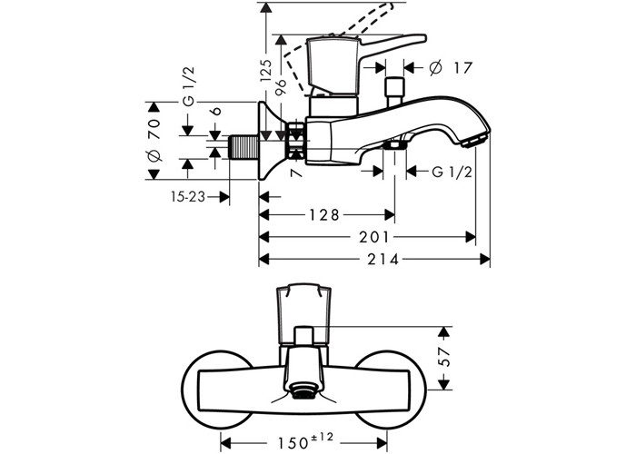 Настенный монтаж, однорычажный, с рычаговой рукояткой, ВМ, цвет - хром. Выступ 123 мм - 128 мм. Тип струи: обычная струя. Материал: латунь.
