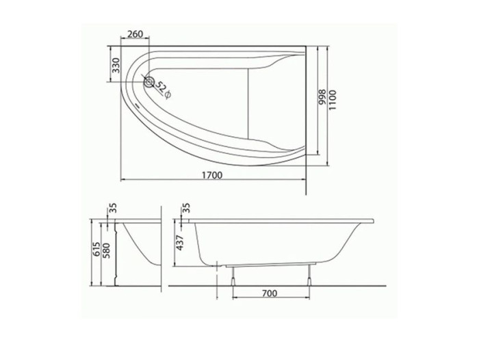 Ванна ассиметричная, правая Коло-Дымер, с ножками и элементами крепления, без подголовника. Длина 1700 мм, ширина 1100 мм, глубина 420 мм, объём 285 л. Для пристенного монтажа