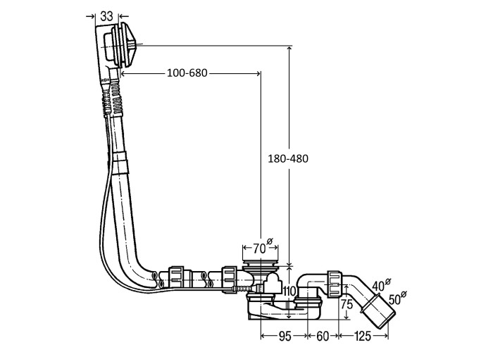 MULTIPLEX сифон для нестандартных ванн 1070 мм (308889), без накладок; плоская конструкция; требуется только 33 мм свободного места за ванной, комплектация: гидрозатвор, сливное колено 45°, хромированная розетка сливного отверстия