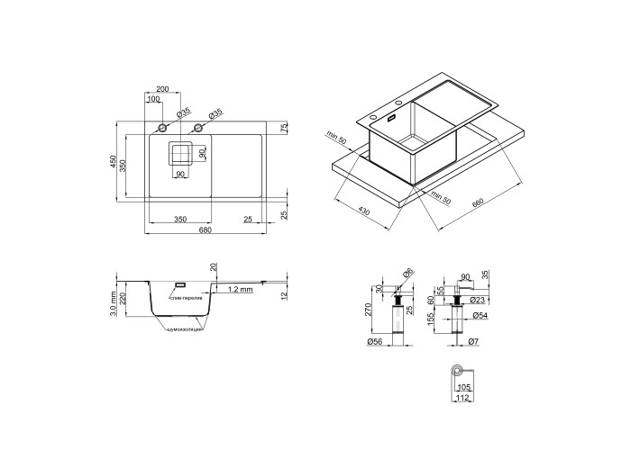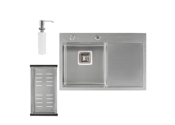 Мойка, дозатор, сифон, слив/перелив, корзинчатый вентиль, сушка для посуды, крепеж.