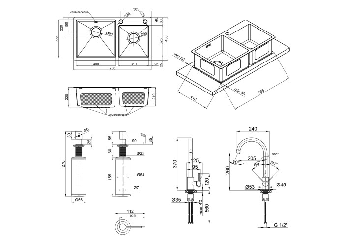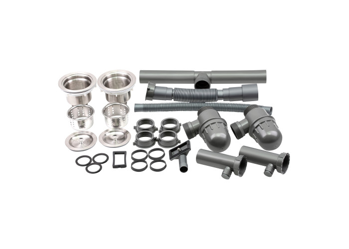 Мойка, смеситель, сушилка, диспенсер, сифон, корзинчатый вентиль, крепеж.