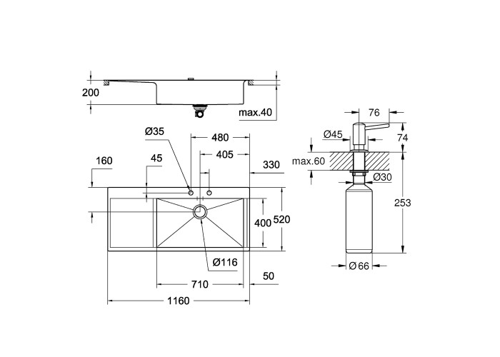 Мийка, сифон, злив/перелив, кошиковий вентиль, дозатор, монтажний набір.