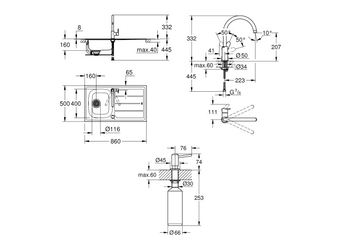 Набір Grohe мийка кухонна K200 31562SD0 + змішувач BauEdge 31367000 + дозатор для миючого засобу Contemporary 40536000