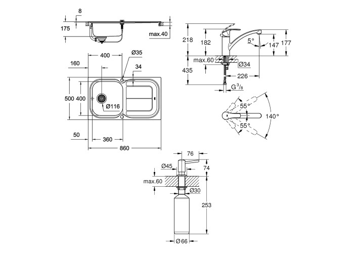 Вид монтажу Мийка: виразний. Змішувач: виразний. Дозатор: вбудований