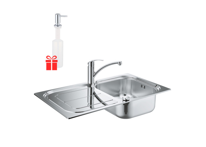 Набір Grohe мийка кухонна K300 31565SD0 + змішувач Eurosmart 33281002 + дозатор для миючого засобу Contemporary 40536000 стане незамінним атрибутом будь-якої сучасної кухні. Стійкість до пошкоджень і чистячих засобів, а також довговічність мийки є результатом якісної нержавіючої сталі, товщиною 1 мм. Зручний змішувач з кутом повороту на 140 ° C дозволить розширити функціональність даної кухонної зони. Зручний дозатор вирішить проблему зберігання миючого засобу.