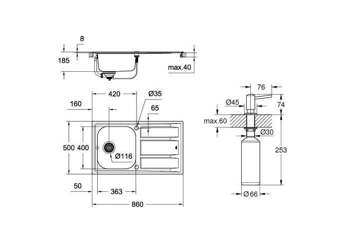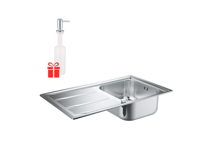 Набор Grohe мойка кухонная K400 31566SD0 + дозатор для моющего средства Contemporary 40536000 станет незаменимым атрибутом любой современной кухни. Устойчивость к повреждениям, чистящим средствам, а также долговечность мойки обеспечивается благодаря качественной нержавеющей стали. Изоляция GROHE Whisper на нижней части мойки уменьшает шум. Дозатор предназначен для хранения моющего средства или жидкого мыла. Он устанавливается под столешницу либо под раковину. Объем резервуара - 500 мл.