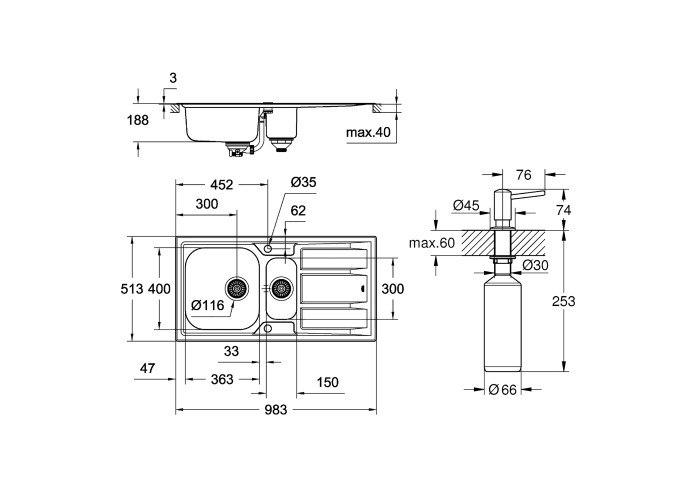 Мийка, сифон, злив/перелив, кошиковий вентиль, дозатор, монтажний набір.