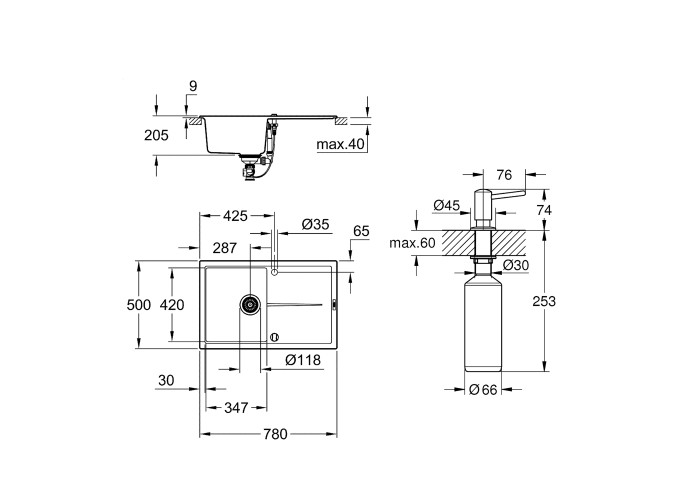 Мийка, сифон, злив/перелив, кошиковий вентиль, дозатор, монтажний набір.