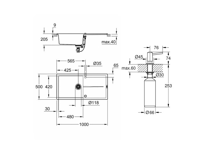 Мийка, сифон, злив/перелив, кошиковий вентиль, дозатор, монтажний набір.