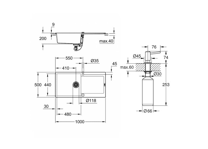 Мийка, сифон, злив/перелив, кошиковий вентиль, дозатор, монтажний набір.