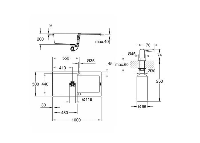 Мийка, сифон, злив/перелив, кошиковий вентиль, дозатор, монтажний набір.
