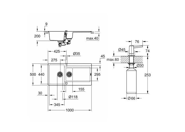 Мийка, сифон, злив/перелив, кошиковий вентиль, дозатор, монтажний набір.