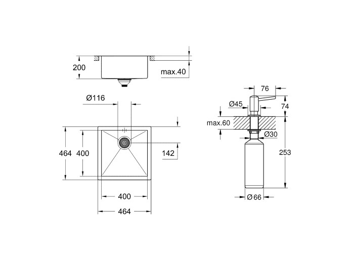 Мийка, сифон, злив/перелив, кошиковий вентиль, дозатор, монтажний набір.