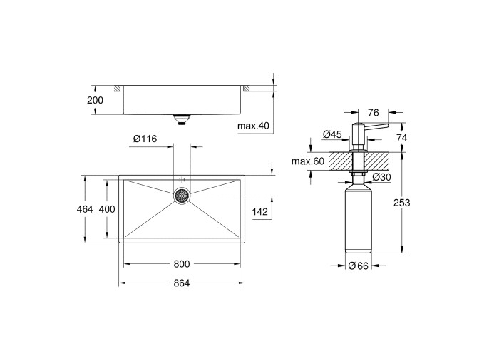 Мийка, сифон, злив/перелив, кошиковий вентиль, дозатор, монтажний набір.