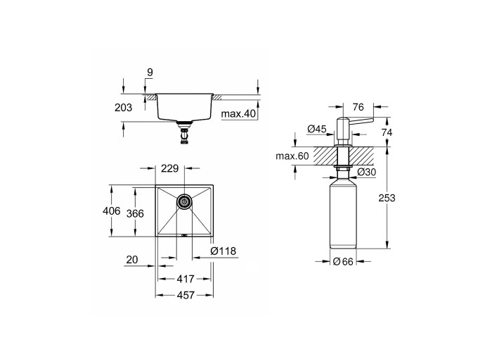 Мойка, сифон, слив/перелив, корзинчатый вентиль, дозатор, монтажный набор.
