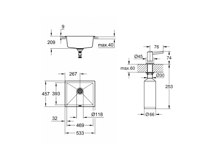 Дополнительные характеристики Корзинчатый вентиль: корзинка Ø 3.5"/90 мм. Отверстие для установки: 468х390 мм. Габариты дозатора: 330х66х110 мм. Типа управления дозатора: нажимной. Объем резервуара дозатора: 500 мл.