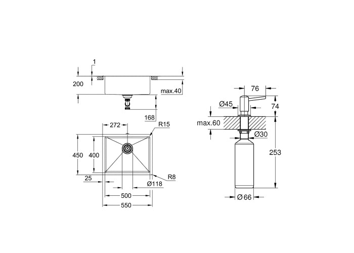 Мийка, сифон, злив/перелив, кошиковий вентиль, дозатор, монтажний набір.