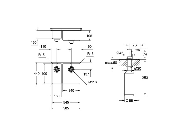 Мийка, сифон, злив/перелив, кошиковий вентиль, дозатор, монтажний набір.
