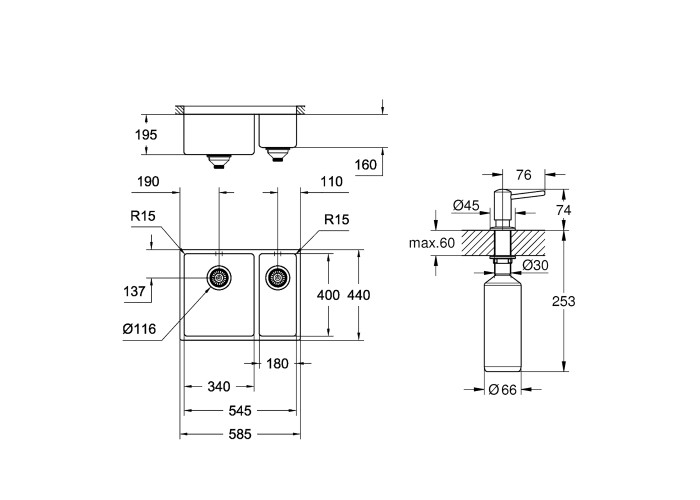 Мийка, сифон, злив/перелив, кошиковий вентиль, дозатор, монтажний набір.