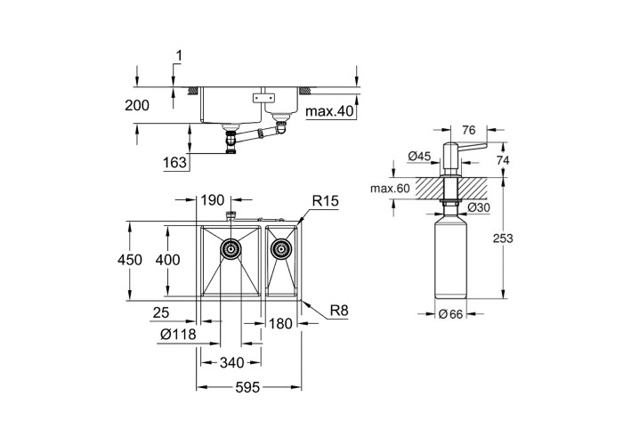 Мойка, слив/перелив, корзинчатый вентиль, дозатор, монтажный набор.