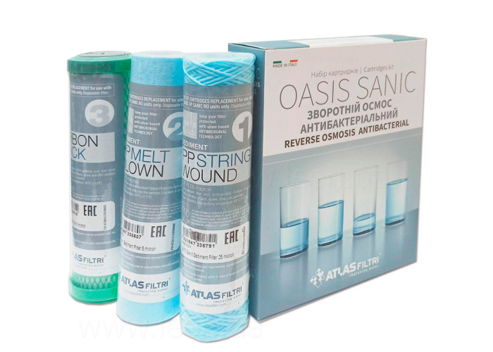 Набор картриджей Oasis DP Sanic Set для систем обратного осмоса от итальянского производителя Atlas Filtri включая картонную упаковку с тремя картриджами: FA SANIC фильтрация механических примесей с антибактериальным эффектом в 25 мкр, CB-EC VOC фильтрация до 5 микрон и уменьшение неприятного вкуса и запаха, концентрации хлора, летучих органических соединений, а также CPP SANIC финальная фильтрация механических примесей с антибактериальным эффектом до 5 мкр.