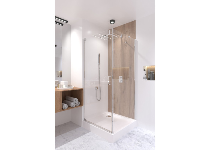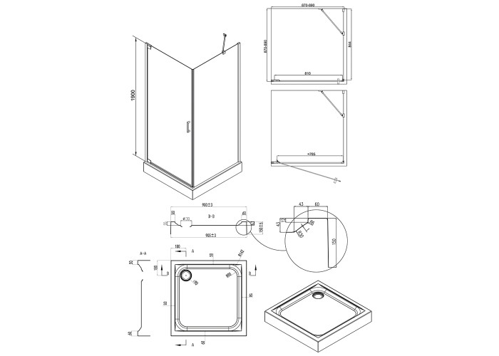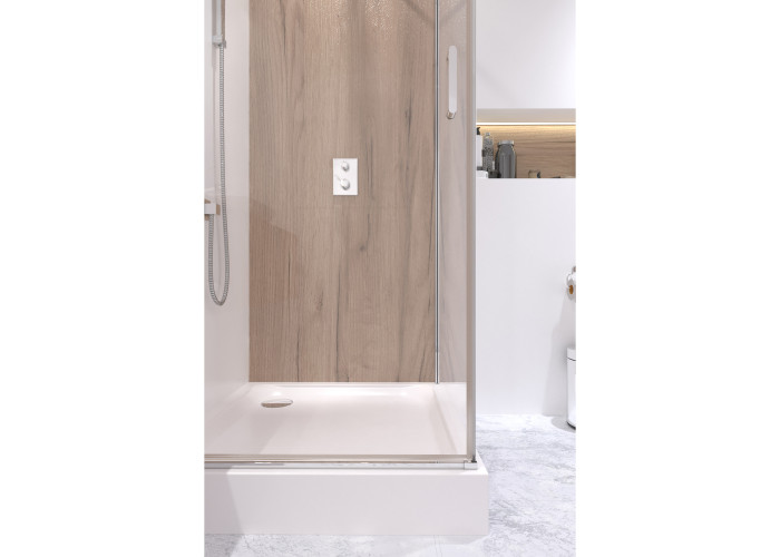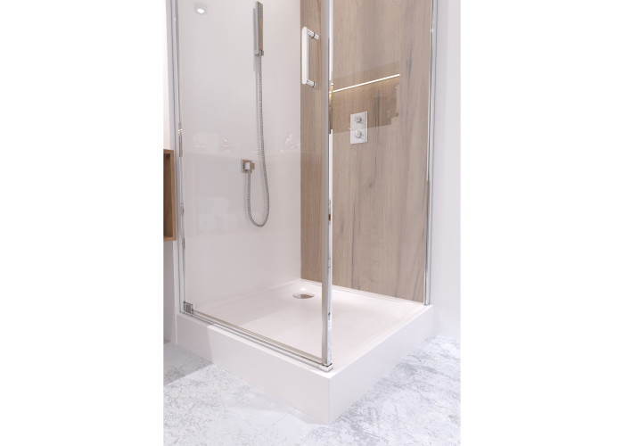 Петли, кронштейн, боковая панель, стеклянная дверь, ручка, нижний борт, комплект крепежей, набор уплотнителей, боковые профили, расширительные профили, заглушки, поддон, сифон с выпуском 40/50мм.