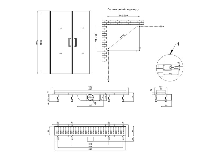 Габариты изделия (ВхШхД), мм Душевая кабина: 1900х945-955х745-755. Трап: 75х640х142