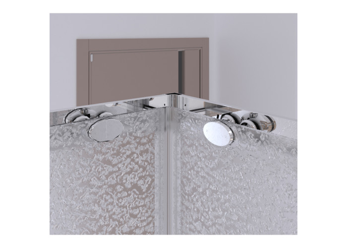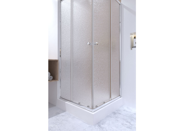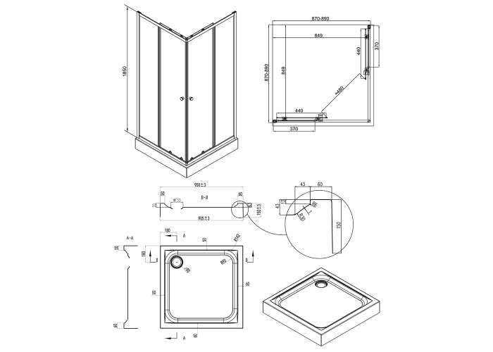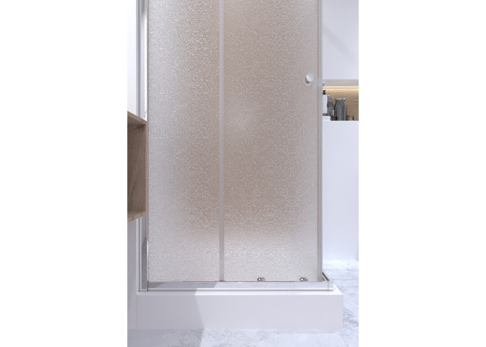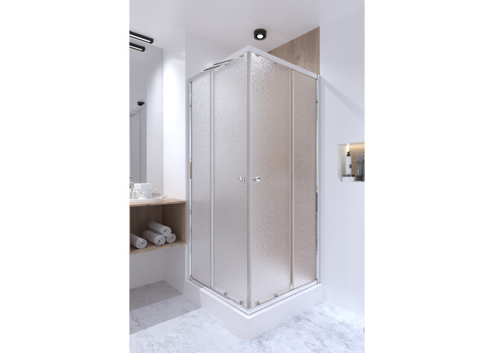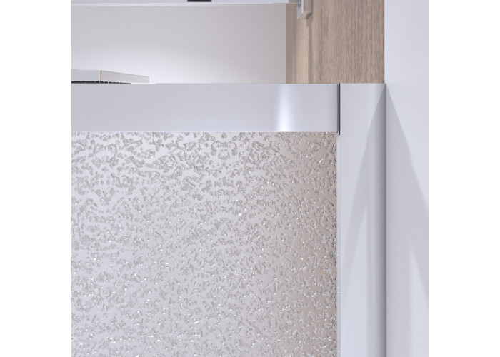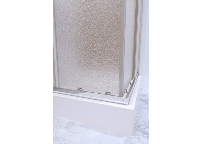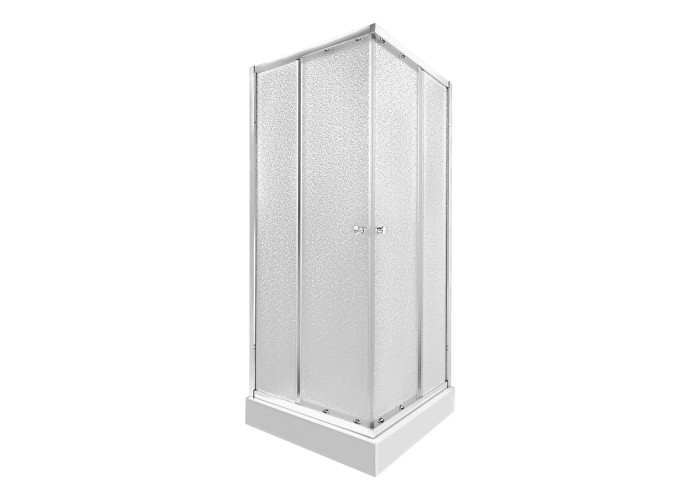 Подвійні ролики, ручки, верхній профіль, нижній профіль, бічні профілі, набір ущільнювачів, розширювальні профілі, 2 скляних дверей, 2 глухих скла, комплект кріплень, заглушки, з‘єднувальні елементи, фіксатори, піддон, сифон з випуском 40/50мм.