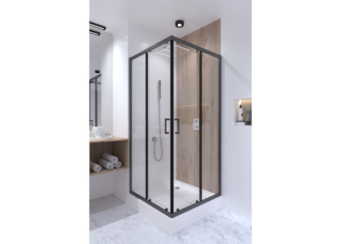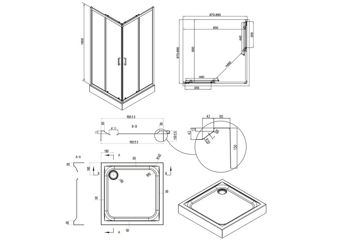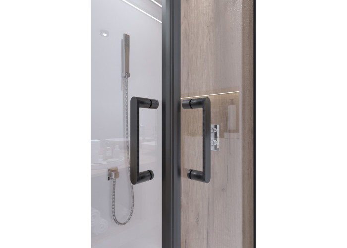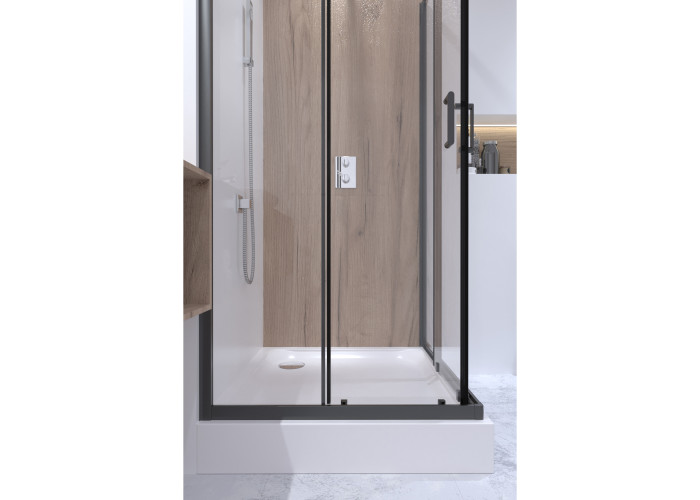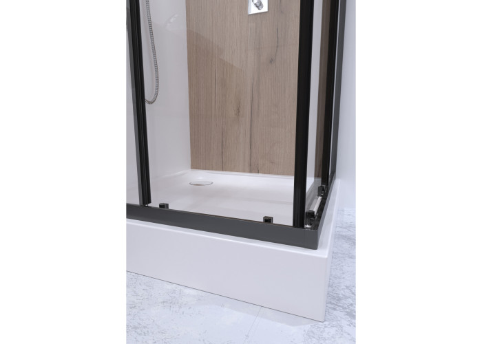 Двойные ролики, ручки, верхний профиль, нижний профиль, боковые профили, набор уплотнителей, расширительные профили, 2 стеклянные двери, 2 глухих стекла, комплект крепежей, заглушки, соединяющие элементы, фиксаторы, поддон, сифон с выпуском 40/50мм.