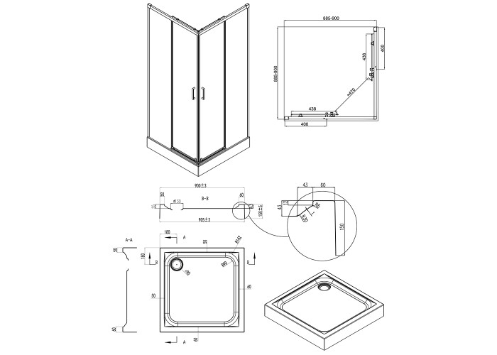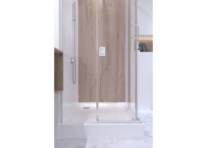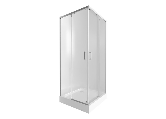Двойные ролики, ручки, верхний профиль, нижний профиль, боковые профили, набор уплотнителей, расширительные профили, 2 стеклянные двери, 2 глухих стекла, комплект крепежей, заглушки, соединяющие элементы, фиксаторы, поддон, сифон с выпуском 40/50мм.