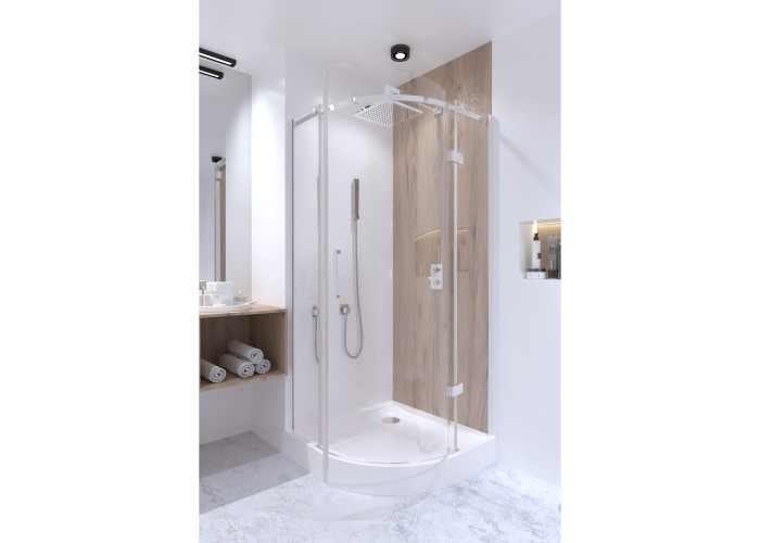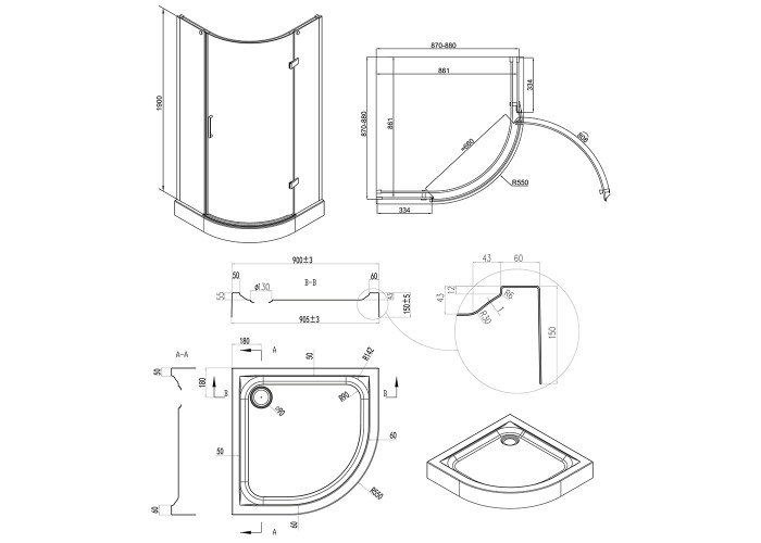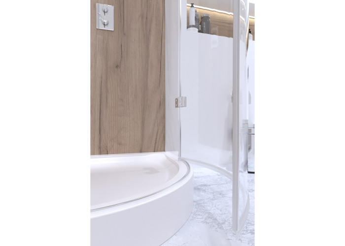 Верхний профиль, нижний борт, боковые профили, расширительные профили, петли, держатели стекла, комплект крепежей, заглушки, ручка, набор уплотнителей, глухие стекла, стеклянная дверь, поддон, сифон с выпуском 40/50мм.