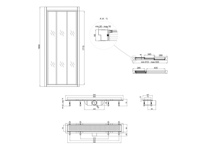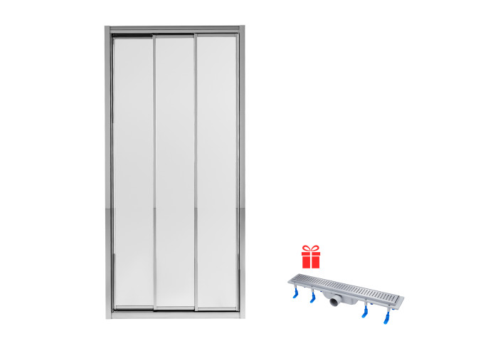 Предустановленные стеклянные двери с профилем, ручки, набор уплотнителей, расширительные профили, заглушки, комплект крепежей, трап с решеткой, ножки, уплотнительная лента.