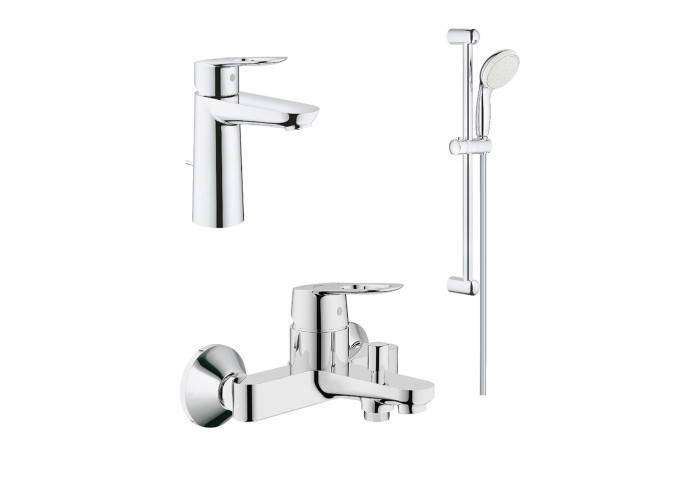 Набор смесителей Grohe BauLoop M-Size 123215M - хорошее дополнение к любой современной ванной комнате. Набор включает в себя смеситель для ванны BauLoop (32815000), смеситель для раковины BauLoop (23762000), душевой гарнитур New Tempesta 100 (27598001). Качественное хромированное покрытие, защитное силиконовое кольцо на лейке и плавный ход рычагов - бесспорные преимущества набора, которые продлят срок эксплуатации.