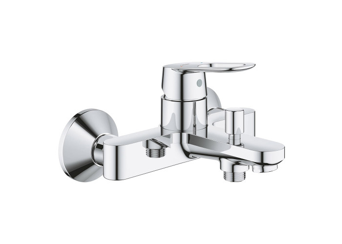 Смеситель для ванны BauLoop (32815000); смеситель для раковины BauLoop (23337000); душевой гарнитур New Tempesta 100 (27598000): лейка для ручного душа, душевой шланг, кронштейн для ручного душа, душевая стойка; гибкая подводка; крепежи.
