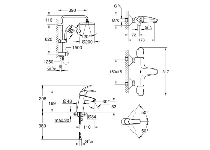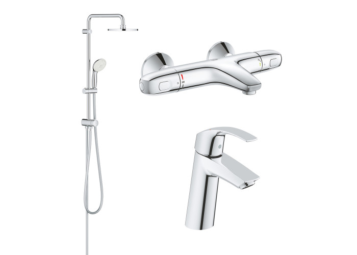 Змішувач термостатичний для ванни Grohtherm 1000 (34155003); змішувач для раковини Eurosmart (23324001); душова стійка Tempesta 27389002: лійка для верхнього душу, лійка для ручного душу, душовий шланг, кронштейн для ручного душу, кронштейн для верхнього душу; гнучка підводка; кріплення.