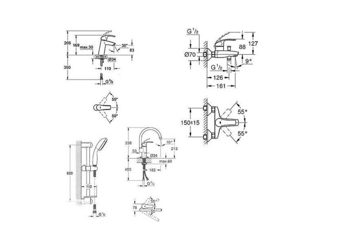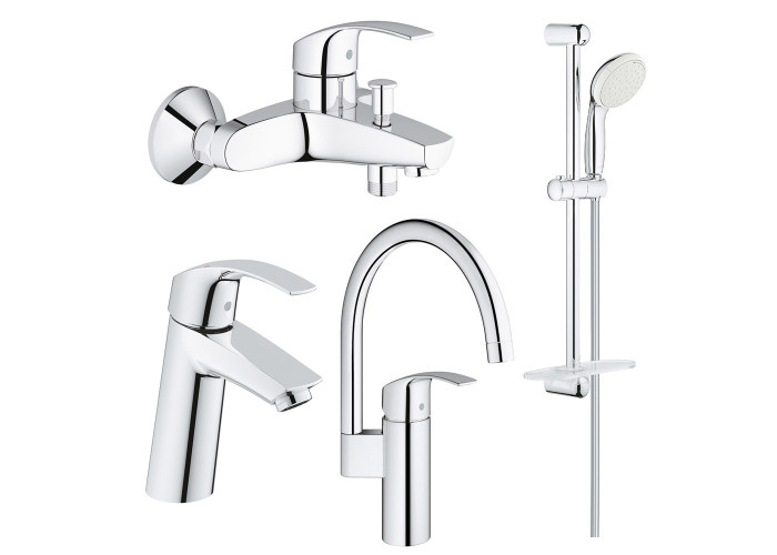 Смеситель для ванны Eurosmart (33300002), смеситель для раковины Eurosmart (23324001), смеситель для кухни Eurosmart (33202002), душевой гарнитур New Tempesta 100 (27926001)