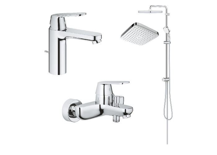 Набор смесителей Grohe Tempesta Cosmopolitan 126112R входит: cмеситель для ванны Eurosmart Cosmopolitan (32831000), смеситель для раковины Eurosmart Cosmopolitan (23325000), душевая стойка Tempesta Cosmopolitan System 250 Cube (26694000). Качественное хромированное покрытие, оптимальный расход воды, плавность хода рычагов - это преимущества данного набора.