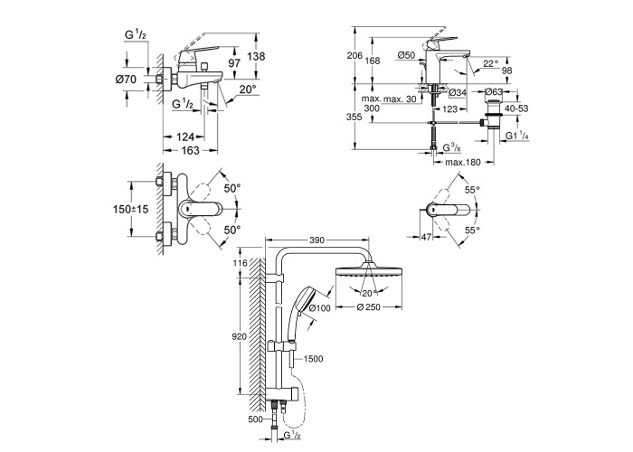 GROHE DreamSpray - оптимальное распределение воды по каждой душевой форсунке. GROHE EcoJoy - водосберегающая технология. GROHE QuickFix - удобный монтаж. GROHE SilkMove - плавность хода рычага. GROHE StarLight - хромированное покрытие. GROHE SpeedClean - предотвращение образования известковых отложений.