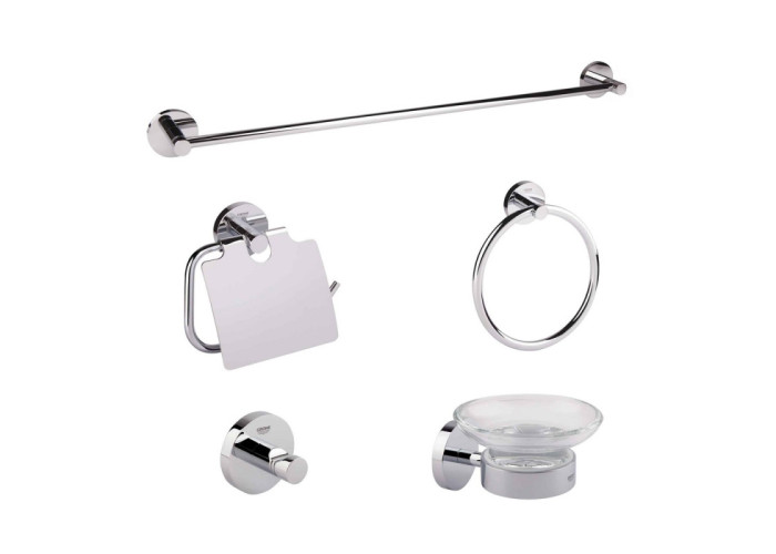 Комплект з кільця для рушника, тримача для рушника 600 мм, гачка для халата, тримача для туалетного паперу (з кришкою) і тримача для мильниці з мильницею, комплект аксесуарів GROHE Essentials виконаний в покритті хром стане ідеальним вибором для вашої ванної. Всі частини комплекту зроблені в дизайні непідвладному часу і з застосуванням сучасних технологій.